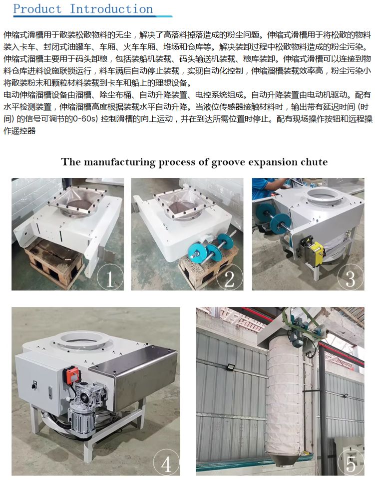 服務電話:13091153069(同微信)伸縮式卸料管是一種物料處理設備,用于將粉末和干散狀物料無塵地裝入或卸入容器、卡車和船只。它是一種自動化且靈活的解決方案,可以根據不同行業的需求進行定制。伸縮式卸料管系統的主要功能是通過垂直的鐵管利用物料自身的重量排放粉末或顆粒狀散裝固體,同時通過外層的一層帆布材料的布筒收集卸料時產生的粉塵。為了適應上部排放點和下部裝載點之間的不同高度,鐵管被設計為可伸縮的。鐵管的靈活性是伸縮式卸料管系統的關鍵特性,它允許根據不同的排放和裝載點進行調整,使其成為廣泛應用的多功能解決方案。